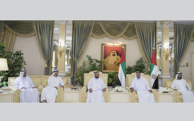 استقبل صاحب السمو الشيخ خليفة بن زايد آل نهيان رئيس الدولة، وأخوه صاحب السمو الشيخ محمد بن راشد آل مكتوم نائب رئيس الدولة رئيس مجلس الوزراء حاكم دبي، وصاحب السمو الشيخ محمد بن زايد آل نهيان ولي عهد أبوظبي نائب القائد الأعلى للقوات المسلحة .. في قصر البطين صباح اليوم إخوانهم أصحاب السمو أعضاء المجلس الأعلى حكام الإمارات.