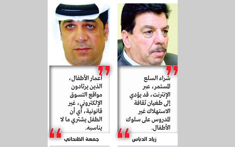 من جهته، طالب مدير مكتب وزارة الاقتصاد فرع الفجيرة، جمعة الظنحاني، المواقع الإلكترونية بوضع شروط تمنع الأطفال من التسوق الإلكتروني، لافتاً إلى أن أعمار الأطفال، الذين يرتادون هذه المواقع للتسوق، غير قانونية، أي أن الطفل لا يدرك ما يلائمه، وقد يقدم على شراء ما لا يناسبه.