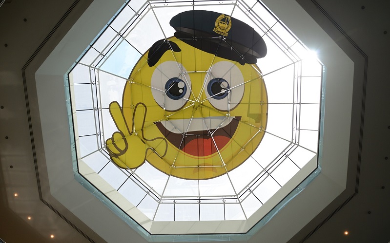 أصبح بإمكان متعاملي مركز شرطة المرقبات أو حتى ركاب الطائرة رؤية الوجه المبتسم على سطح مبنى مركز شرطة المرقبات.