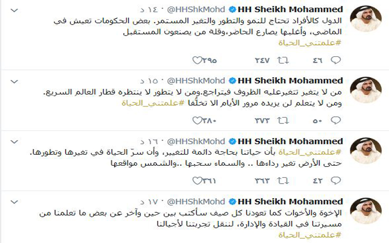 قال صاحب السمو الشيخ محمد بن راشد آل مكتوم نائب رئيس الدولة رئيس مجلس الوزراء حاكم دبي، عبر "تويتر": "الإخوة والأخوات كما تعودنا كل صيف سأكتب بين حين وآخر عن بعض ما تعلمنا من مسيرتنا في القيادة والإدارة، لننقل تجربتنا لأجيالنا #علمتني_الحياة".
