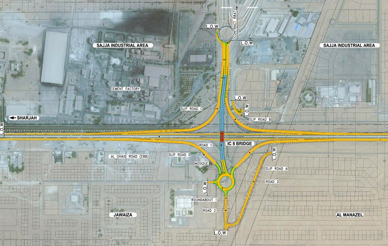 وأفاد أن المشروع يشتمل على إنشاء جسر جديد لإحلال الجسر الثامن المقام على طريق الشارقة - الذيد. يتكون هذا الجسر من الخرسانة المسلحة المسبقة الإجهاد بطول 52 متر ويسمح بمرور طريق علوي مزدوج مكون من حارتين للسير بعرض "7,3 متر" في كل إتجاه، يتصل هذا الجسر عند طرفيه بدوارين مع عدد 4 طرق كمخارج حرة مكونة من حارتين للسير بعرض "7,3 متر" وطول إجمالي "2,6كم"، بحيث يعمل هذا الجسر على نقل الحركة بين منطقة الصجعة الصناعية والمناطق المجاورة وطريق الذيد بصورة مثلى. يسمح هذا الجسر أيضا بأعمال التوسعة المستقبلية لطريق الذيد المار أسفل الجسر وكذلك تم تصميم مناسيب المنحدر المتصلة بأحد طرفي الجسر والواقعة ضمن طرق المخارج الحرة، هذا بالإضافة لأعمال الخدمات المصاحبة.