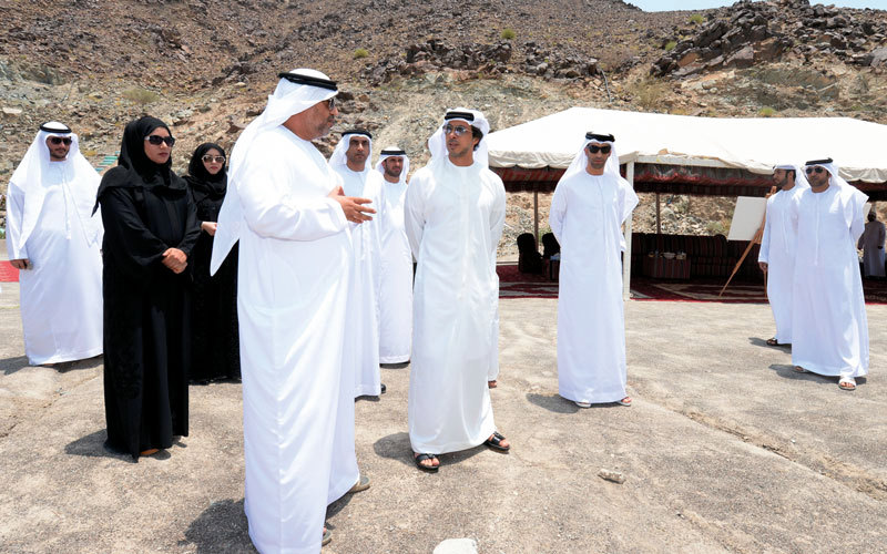 منصور بن زايد استمع إلى شرح عن إسهام السد في تغذية المياه الجوفية. وام