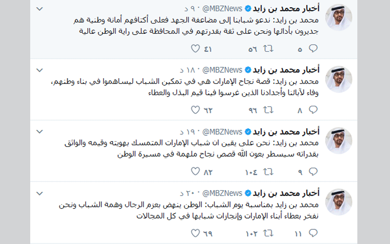 وأضاف سموه عبر تغريدات نشرها حساب أخبار محمد بن زايد على موقع التواصل الاجتماعي "تويتر" بمناسبة يوم الشباب العالمي الذي يصادف في 12 أغسطس من كل عام: "قصة نجاح الإمارات هي في تمكين الشباب ليساهموا في بناء وطنهم، وفاء لآبائنا وأجدادنا الذين غرسوا فينا قيم البذل والعطاء".