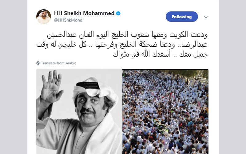 نشر صاحب السمو الشيخ محمد بن راشد آل مكتوم، نائب رئيس الدولة رئيس مجلس الوزراء حاكم دبي، اليوم، تغريدة في حسابه على موقع التواصل الاجتماعي (تويتر) رثا فيها الفنان الكويتي عبد الحسين عبد الرضا الذي وافته المنية قبل أيام في لندن بعد تعرضه لوعكة صحية.