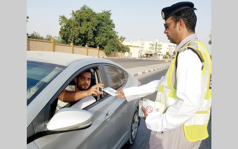شرطة عجمان خلال توزيع بروشورات توعية على السائقين. من المصدر