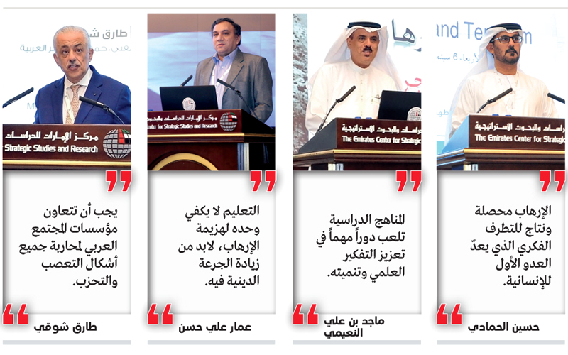 جاء ذلك في ندوة نظمها مركز الإمارات للدراسات والبحوث الاستراتيجية، أمس، تحت عنوان «التعليم والتطرف والإرهاب»، بحضور وزير التربية والتعليم، الدكتور حسين بن إبراهيم الحمادي، ووزير التربية والتعليم والتعليم الفني في مصر، الدكتور طارق شوقي، ووزير التربية والتعليم رئيس مجلس التعليم العالي في البحرين، الدكتور ماجد بن علي النعيمي، وكتّاب وصحافيون ورجال إعلام، ومثقفون ومهتمون بقضايا التربية والتعليم.