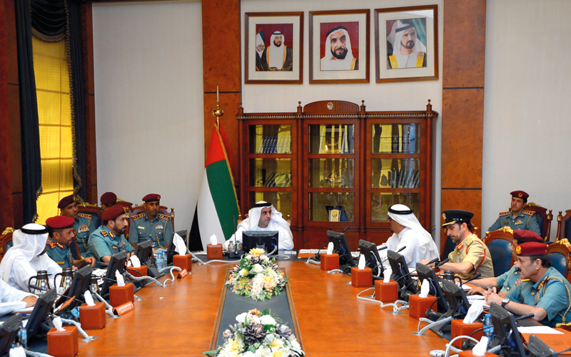 سيف بن زايد أثناء الاجتماع الذي استعرض مبادرات ومشروعات تستهدف تطوير العمل الشرطي. من المصدر