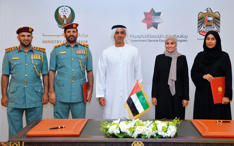 سيف بن زايد شهد توقيع الاتفاق بين «الإمارات للخدمة الحكومية» و«الداخلية» الهادف إلى تطبيق مؤشر السعادة في مراكز إسعاد المتعاملين. وام
