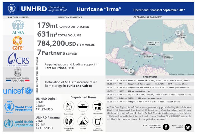 قال مستودع الأمم المتحدة للاستجابة الإنسانيةأن أول استجابة لدعم مهمتنا لمواجهة اعصار "ايرما" جاءت من بعث صاحب السمو الشيخ محمد بن راشد آل مكتوم نائب رئيس الدولة رئيس مجلس الوزراء حاكم دبي عبر طائرة اغاثية وصلت لهاييتي.