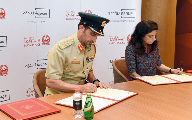 وقّع المذكرة القائد العام لشرطة دبي، اللواء عبدالله خليفة المري، والرئيس التنفيذي لمجموعة تيكوم، الدكتورة أمينة الرستماني، في حي دبي للتصميم.