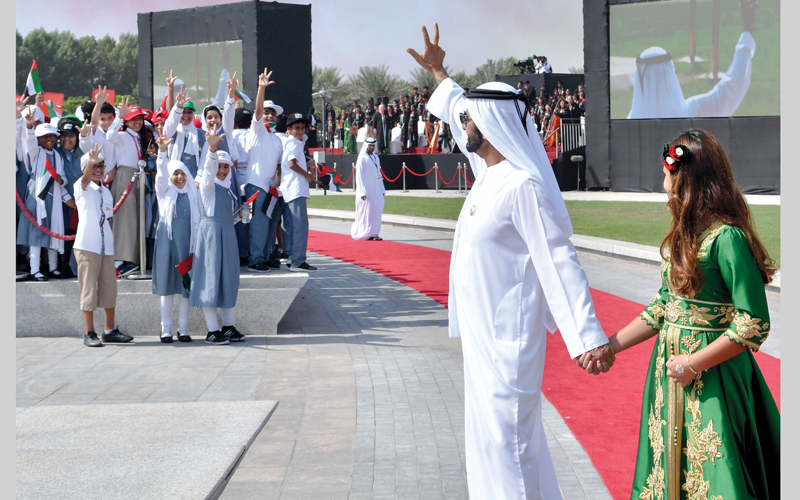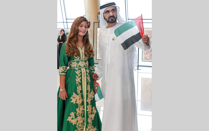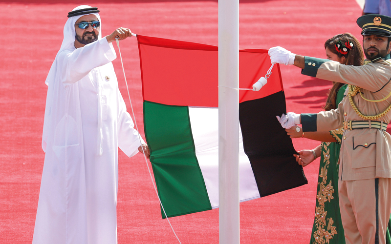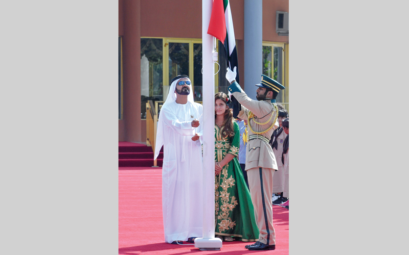 جاء ذلك، بمناسبة الاحتفال بـ«يوم العَلَم»، حيث قام سموّه برفع عَلَم الدولة في دار الاتحاد بدبي، الذي شهد قبل 46 عاماً توقيع الوثيقة الخاصة بتأسيس دولة الاتحاد، إيذاناً ببدء احتفالات الدولة بـ«يوم العَلَم»، ضمن التقليد السنوي الذي أطلقه سموّه في عام 2013، وذلك ضمن احتفالية كبيرة شارك فيها جمع من طلبة المدارس وأصحاب الهمم.