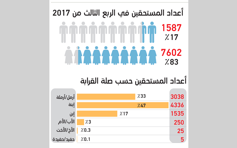 وذكرت أن فئة الأرامل (من الذكور والإناث) تعدّ ثاني أكثر الفئات المستحقة المسجلة لدى الصندوق بـ3038 مستحقاً يشكلون 33%، تليها فئة الأبناء الذكور بإجمالي 1535 مستحقاً بنسبة 17%، ثم فئة الآباء والأمهات، الذين بلغ عددهم 250 مستحقاً بنسبة 3% من عدد المستحقين المسجلين لدى الصندوق، تليها فئة الأخوة بإجمالي 25 مستحقاً، وأخيراً فئة المعاش التقاعدي من الأحفاد، الذين لم يزد عددهم على خمسة مستحقين.