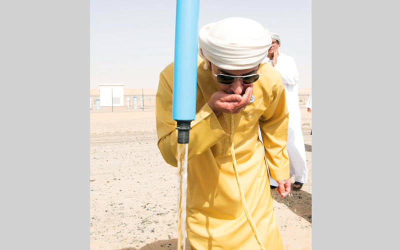 جاء ذلك خلال تصريح لسموه، بعد زيارته مشروع الخزان الاستراتيجي الكبير للمياه، الذي يعد أضخم مشروع في العالم لتخزين المياه العذبة، ويضم شبكة تتكون من 315 بئراً تمتد تحت رمال صحراء ليوا، وبقدرة تخزين تتجاوز 5.6 مليارات غالون من المياه العذبة.