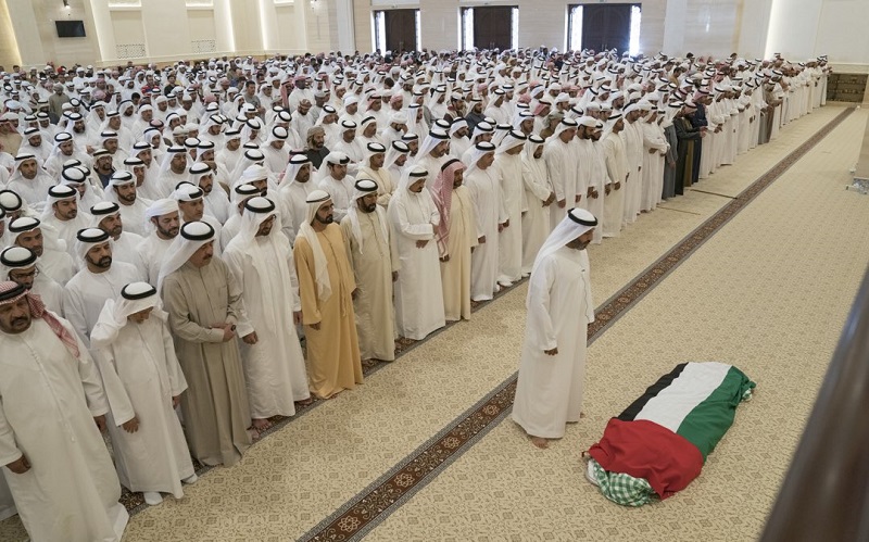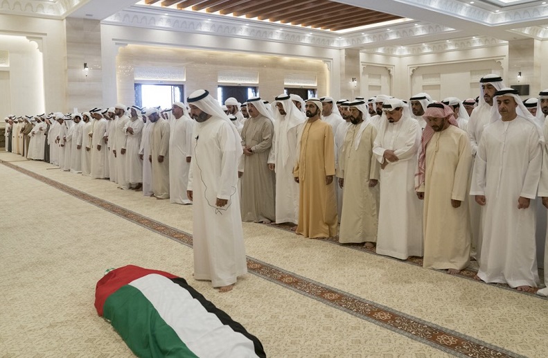 كما أدى صلاة الجنازة إلى جانب سموهما، صاحب السمو الشيخ حميد بن راشد النعيمي عضو المجلس الأعلى حاكم عجمان وصاحب السمو الشيخ سعود بن راشد المعلا عضو المجلس الأعلى حاكم أم القيوين وسمو الشيخ سلطان بن زايد آل نهيان ممثل صاحب السمو رئيس الدولة وسمو الشيخ حمدان بن راشد آل مكتوم نائب حاكم دبي وزير المالية وسمو الشيخ مكتوم بن محمد بن راشد آل مكتوم نائب حاكم دبي وسمو الشيخ طحنون بن محمد آل نهيان ممثل الحاكم في منطقة العين وسمو الشيخ سرور بن محمد آل نهيان وسمو الشيخ نهيان بن زايد آل نهيان رئيس مجلس أمناء مؤسسة زايد بن سلطان آل نهيان للأعمال الخيرية والإنسانية والفريق سمو الشيخ سيف بن زايد آل نهيان نائب رئيس مجلس الوزراء وزير الداخلية وسمو الشيخ حامد بن زايد آل نهيان رئيس ديوان ولي عهد أبوظبي وسمو الشيخ عمر بن زايد آل نهيان نائب رئيس مجلس أمناء مؤسسة زايد بن سلطان آل نهيان للأعمال الخيرية والإنسانية وسمو الشيخ خالد بن زايد آل نهيان رئيس مجلس إدارة مؤسسة زايد العليا للرعاية الإنسانية وذوي الاحتياجات الخاصة وسمو الشيخ الدكتور سلطان بن خليفة آل نهيان مستشار صاحب السمو رئيس الدولة وسمو الشيخ محمد بن خليفة آل نهيان عضو المجلس التنفيذي وسمو الشيخ أحمد بن سعيد آل مكتوم رئيس هيئة دبي للطيران الرئيس الأعلى لمجموعة طيران الإمارات والشيخ الدكتور سعيد بن محمد آل نهيان والشيخ نهيان بن مبارك آل نهيان وزير التسامح والشيخ سلطان بن طحنون آل نهيان عضو المجلس التنفيذي واللواء الركن طيار الشيخ أحمد بن طحنون بن محمد آل نهيان رئيس هيئة الخدمة الوطنية والاحتياطية واللواء الركن بحري طيار الشيخ سعيد بن حمدان بن محمد آل نهيان قائد القوات البحرية والشيخ خليفة بن طحنون بن محمد آل نهيان مدير مكتب شؤون أسر الشهداء في ديوان ولي عهد أبوظبي والعميد الشيخ محمد بن طحنون آل نهيان مدير عام شؤون الأمن والمنافذ بالقيادة العامة لشرطة أبوظبي والشيخ ذياب بن طحنون آل نهيان والشيخ هزاع بن طحنون آل نهيان وكيل ديوان ممثل الحاكم في منطقة العين والشيخ زايد بن طحنون آل نهيان والشيخ زايد بن طحنون آل نهيان.