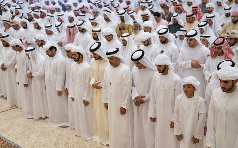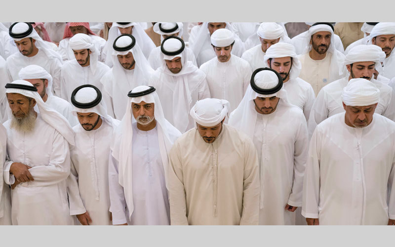 محمد بن راشد ومحمد بن زايد والحكام وعموم آل نهيان وجموع المواطنين يؤدون صلاة الجنازة على الفقيدة الشيخة حصة بنت محمد آل نهيان في مسجد المعترض بالعين