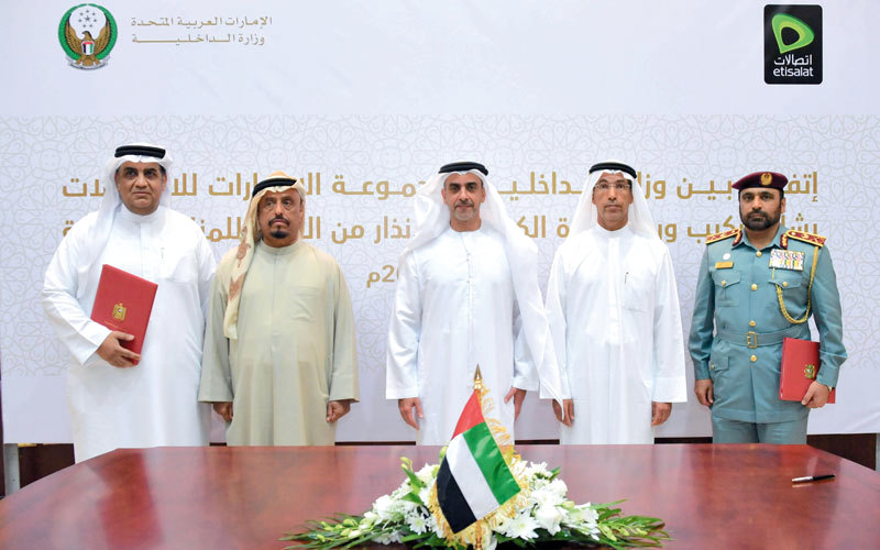 شهد الفريق سمو الشيخ سيف بن زايد آل نهيان، نائب رئيس مجلس الوزراء وزير الداخلية، أمس، توقيع اتفاق بين وزارة الداخلية، ومجموعة الإمارات للاتصالات (اتصالات)، لتعزيز الخدمات الذكية واستثمارها في تعزيز الإجراءات الوقائية والسلامة العامة في المنشآت والبيوت السكنية، تنفيذاً لتوجيهات صاحب السمو الشيخ محمد بن راشد آل مكتوم، نائب رئيس الدولة رئيس مجلس الوزراء حاكم دبي.