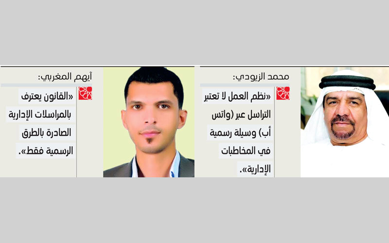 مدير دائرة الموارد البشرية في الفجيرة، محمد الزيودي، اعتبر أن قروبات العمل على «واتس أب» مطلوبة لتقليص دورة العمل، وتجنب الأخطاء، وتسريع إنجاز العمل، لكن في الوقت ذاته، لا تعتبر نظم العمل هذه الوسيلة رسمية في المخاطبات الإدارية، وطالما أن هذا الأمر لم يحسم بعد، فمن غير المناسب أن يقوم المدير بتكليف الموظفين بتنفيذ الأعمال من خلال هذا التطبيق، مبيناً أن قرار الطرد أو طلب الاستقالة أو غيرهما من الإجراءات، غير مقبولة إلا بطلب كتابي ومصدّقة بختم المنشأة.