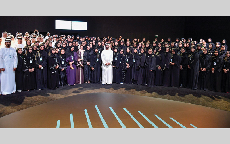 محمد بن راشد يتوسط المتطوعين في دورة القمة العالمية للحكومات 2016. أرشيفية ــ من المصدر