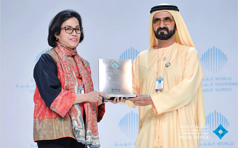 محمد بن راشد يكرم سيري مولياني اندراواتي الفائزة بجائزة "أفضل وزير في العالم"