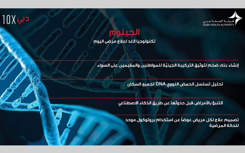 قدمت هيئة الصحة بدبي مشروع «الجينوم» خلال الدورة السادسة من القمة العالمية للحكومات في فبراير الجاري، في إطار مشاركتها بمبادرة «دبي10X»، وهو يعزز الجهود الرامية إلى إبطاء عملية الشيخوخة، والحد من الإعاقات الجينية، والقضاء على الأمراض المزمنة.