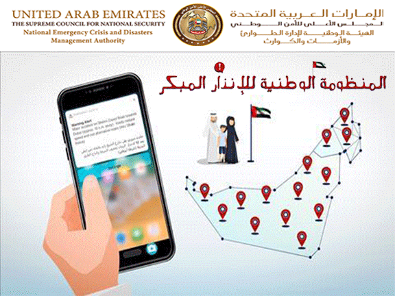 وتابع: أن الهيئة تعمل دائما على تبني أفضل المواصفات والممارسات العالمية في مجال الطوارئ والأزمات، وبشكل خاص في مجال الإنذار المبكر، حيث تمكنت الهيئة من تبني معايير دولية بما يخص الرسائل التحذيرية على الهواتف المحمولة ، وبالتنسيق مع الهيئة العامة لتنظيم قطاع الاتصالات تم إصدار مواصفات خاصة بالدولة والإشراف على تطبيق هذه المواصفات الفنية من قبل مصنعي الهواتف المحمولة، بالإضافة إلى ذلك، فقد تم تأهيل وتفعيل شبكات الاتصالات للمرخص لهم في الدولة لتتوافق مع المتطلبات الفنية للمنظومة.