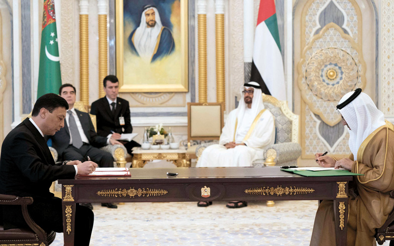 محمد بن زايد ورئيس تركمانستان بحثا تطوير العلاقات بين البلدين.. وشهدا توقيع الاتفاقات