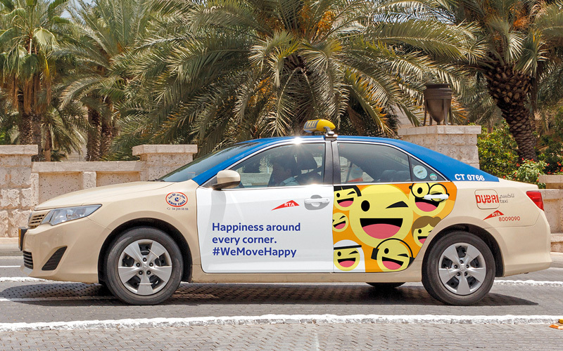 تغليف حافلات ومركبات أجرة بشعار أسبوع السعادة. من المصدر