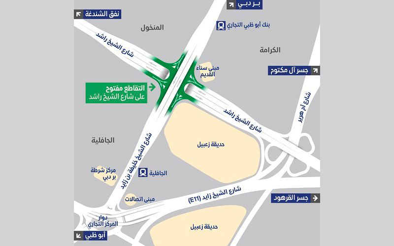 وأضاف: يتضمن المشروع إنشاء جسرين على شارع الشيخ خليفة بن زايد بسعة مسارين في كل اتجاه يؤمن انسيابية في الحركة المرورية من دوار مركز دبي التجاري العالمي إلى تقاطع شارع الشيخ خليفة بن زايد مع شارع الكويت والعكس، وجسر أخر من شارع زعبيل بالاتجاه إلى شارع الشيخ راشد بسعة مسار واحد، كما يتضمن المشروع إنشاء نفق على شارع الشيخ راشد بالاتجاه إلى تقاطع شارع الشيخ راشد مع شارع المنخول، بسعة أربعة مسارات في كل اتجاه، ويشتمل المشروع كذلك على تنفيذ تقاطع محكوم بإشارات ضوئية أسفل الجسر، وستكون الحركة المرورية حرة للالتفاف من الطرق الرئيسة إلى الطرق الفرعية، إضافة إلى تنفيذ أعمال الإنارة والأرصفة وقنوات وأنظمة الري والصرف الصحي، وتصريف مياه الأمطار وأعمال تحويل وحماية الخدمات مثل خطوط كهرباء والمياه، واتصالات.