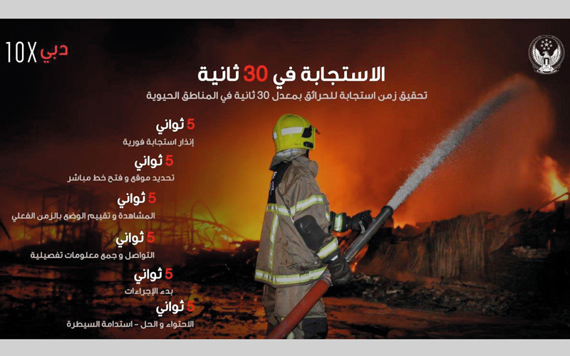 طوّرت الإدارة العامة للدفاع المدني في دبي، مبادرة «الاستجابة في 30 ثانية»، بهدف تسريع زمن الاستجابة للحرائق بمعدل لا يتجاوز نصف دقيقة في المناطق الحيوية في دبي، وذلك تنفيذاً لرؤية صاحب السمو الشيخ محمد بن راشد آل مكتوم، نائب رئيس الدولة رئيس مجلس الوزراء حاكم دبي، الرامية إلى أن تكون دبي من أكثر مدن العالم أماناً.وتأتي هذه الخطوة في إطار التعاون مع مؤسسة دبي للمستقبل، وضمن مبادرة «دبي 10x»، التي أطلقها سمو الشيخ حمدان بن محمد بن راشد آل مكتوم، ولي عهد دبي رئيس مجلس أمناء مؤسسة دبي للمستقبل، خلال الدورة السادسة من القمة العالمية للحكومات، فبراير الماضي، بهدف تحويل ما ستطبقه مدن العالم بعد 10 سنوات إلى واقع يعيشه مجتمع دبي اليوم تأكيداً لمكانتها كمدينة المستقبل.