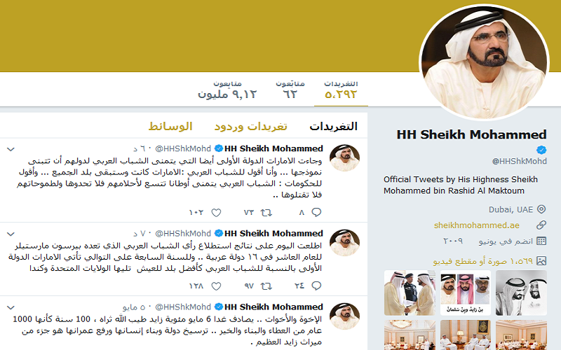 وأضاف سموه في تغريدات على حسابه الرسمي في "تويتر": "وجاءت الامارات الدولة الأولى أيضا التي يتمنى الشباب العربي لدولهم أن تتبنى نموذجها ... وأنا أقول للشباب العربي :الامارات كانت وستبقى بلد الجميع ... وأقول للحكومات : الشباب العربي يتمنى أوطانا تتسع لأحلامهم فلا تحدوها ولطموحاتهم فلا تقتلوها" ..