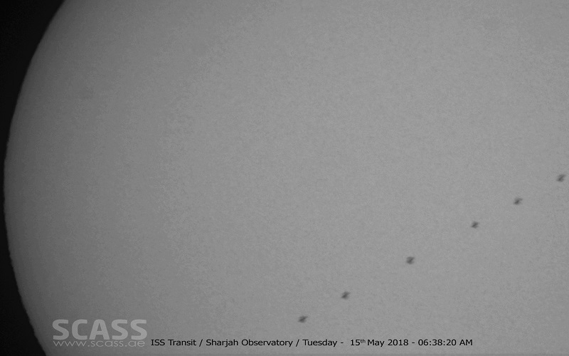 قال "مرصد الشارقة الفلكي" التابع لمركز الشارقة لعلوم الفضاء و الفلك، إنه رصد عبور محطة الفضاء الدولية ظاهريا أمام قرص الشمس ، و ذلك الساعة 06:38 من صباح اليوم الثلاثاء الموافق 15 مايو 2018 ، و استغرق العبور الظاهري للمحطة امام قرص الشمس مدة لا تتجاوز الثانيتين ، و كانت الشمس على ارتفاع 13 درجة فوق الأفق ذلك الوقت، و تبعد المحطة عن موقع الرصد في الشارقة مسافة 1280 كم .