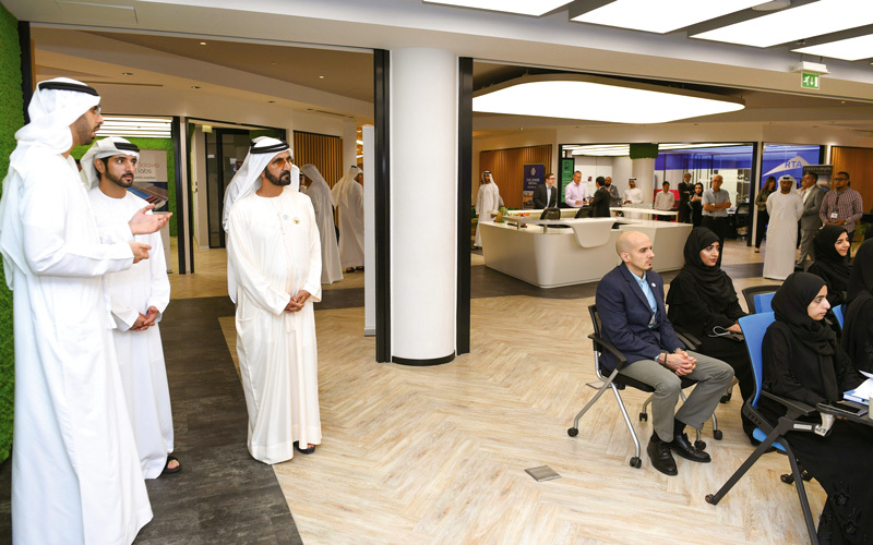 محمد بن راشد يستمع إلى شرح عن البرنامج الهادف إلى التعريف بتقنيات الذكاء الاصطناعي. وام