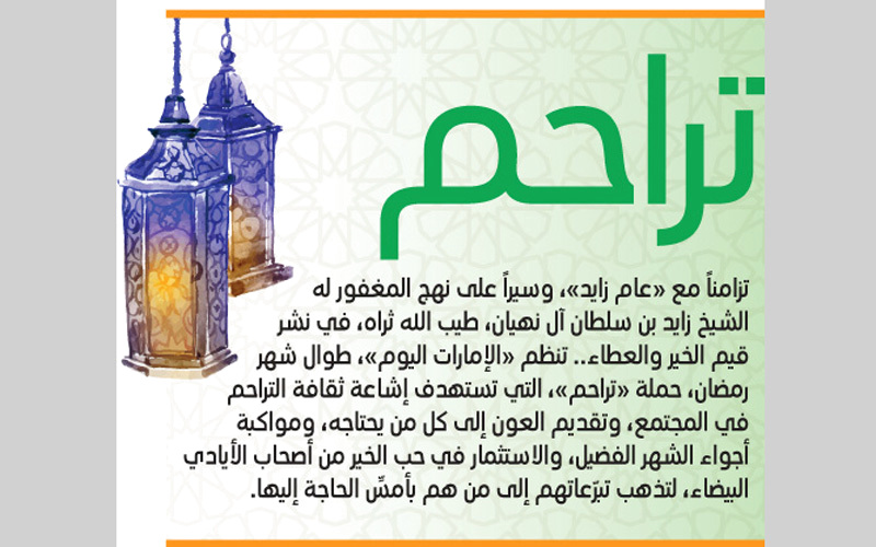 تطلق «الإمارات اليوم»، ابتداءً من اليوم غرة شهر رمضان المبارك، حملة «تراحم»، التي تستهدف إشاعة ثقافة التراحم في المجتمع، وتقديم العون إلى كل من يحتاجه.