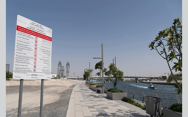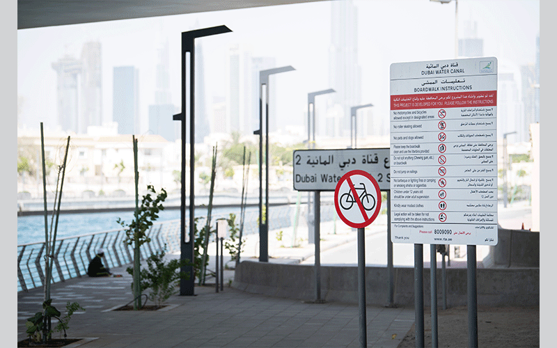 تعليمات تحذيرية بعدم القفز في المياه على طول ممشى "دبي المائية"