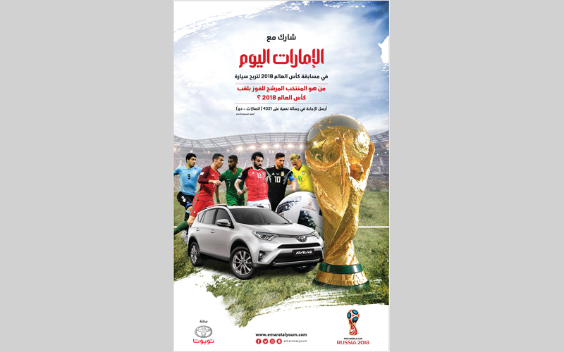 أطلقت صحيفة «الإمارات اليوم»، بالتعاون مع «الفطيم للسيارات»، أمس، جائزة عبارة عن سيارة «تويوتا راف فور»، للفائز بالمسابقة الرياضية، بمناسبة كأس العالم 2018 لكرة القدم التي تجرى حالياً في روسيا وتستمر حتى 15 الشهر المقبل.