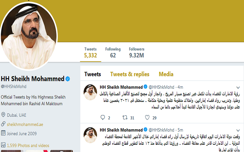 وأضاف صاحب السمو الشيخ محمد بن راشد آل مكتوم نائب رئيس الدولة رئيس مجلس الوزراء حاكم دبي، "رؤية الامارات للفضاء بدأت تكتمل عبر تصنيع مسبار المريخ ، وانجاز أول مجمع لتصنيع الأقمار الصناعية بالكامل وطنيا، وتدريب رواد فضاء إماراتيين، وامتلاك منظومة علمية وبحثية متكاملة .. سنحتفل في ٢٠٢١ بخمسين عاما على دولتنا وسنهدي انجازنا للأجيال القادمة لتبدأ أحلامهم دائما من السماء".