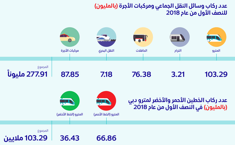 كشف المدير العام ورئيس مجلس المديرين في هيئة الطرق والمواصلات في دبي، مطر الطاير، أن وسائل النقل الجماعي في دبي، التي تشمل مترو دبي وترام دبي وحافلات المواصلات العامة، ووسائل النقل البحري (العبرات والفيري والتاكسي المائي والباص المائي)، إضافة إلى مركبات الأجرة (تاكسي دبي وشركات الامتياز)، نقلت في النصف الأول من عام 2018، وفقاً للأرقام الصادرة من الهيئة، 277 مليوناً و910 آلاف راكب، مقارنة بنحو 275 مليوناً و242 ألف راكب في الفترة ذاتها من العام المنصرم، وبلغ المتوسط اليومي لعدد مستخدمي وسائل النقل الجماعي في النصف الأول من العام الجاري قرابة مليون و535 ألف راكب.