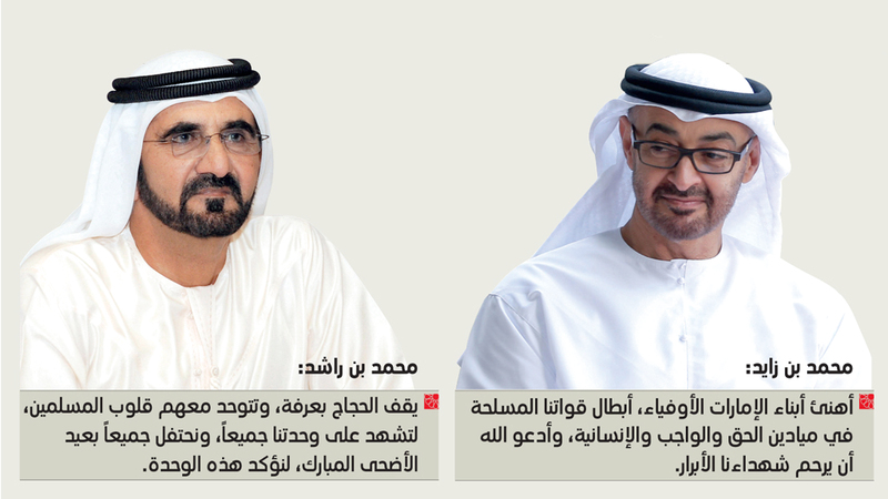 وكتب سموه في تغريدة نشرها على موقع «تويتر»: «يقف الحجاج بعرفة.. وتتوحد معهم قلوب المسلمين من أنحاء العالم كافة، لتشهد على وحدتنا جميعاً، تاريخياً وحضارياً ودينياً، ونحتفل جميعاً بعيد الأضحى المبارك، لنؤكد هذه الوحدة. أعاده الله على شعب الإمارات وجميع الشعوب العربية والإسلامية بالخير والبركة، وكل عام وأنتم وأهليكم بكل خير».
