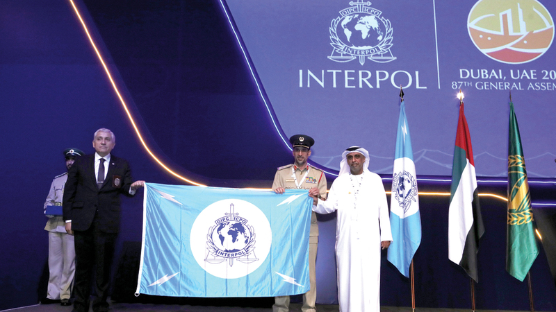 وسلم القائد العام لشرطة دبي، اللواء عبدالله خليفة المري، يرافقه مساعده لشؤون البحث الجنائي، اللواء خليل المنصوري، علم الإنتربول إلى رئيس وفد جمهورية تشيلي، معلناً بشكل رسمي استضافتها للاجتماع رقم 88 للجمعية العمومية للإنتربول، العام المقبل.