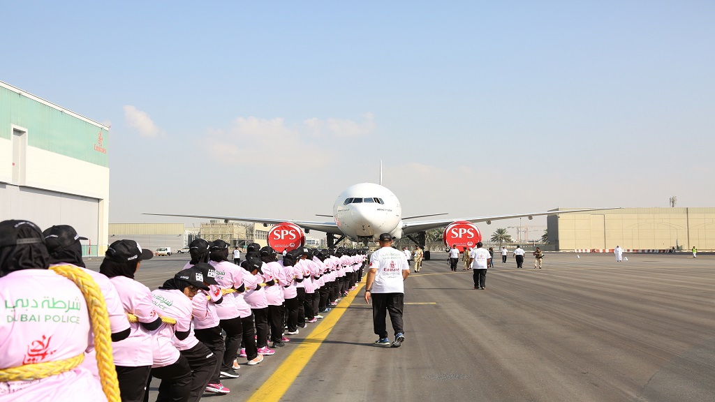 العنصر النسائي في شرطة دبي يسحب طائرة بوينغ 777