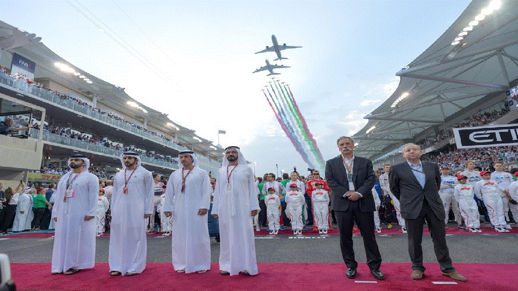 شهد صاحب السمو الشيخ محمد بن راشد آل مكتوم نائب رئيس الدولة رئيس مجلس الوزراء حاكم دبي، وصاحب السمو الشيخ محمد بن زايد آل نهيان ولي عهد أبوظبي نائب القائد الأعلى للقوات المسلحة، وصاحب السمو الملكي الأمير محمد بن سلمان آل سعود ولي العهد نائب رئيس مجلس الوزراء وزير دفاع المملكة العربية السعودية، اليوم، بحضور أصحاب الفخامة والسمو ورؤساء الوفود من الدول الشقيقة والصديقة ضيوف الدولة وسمو أولياء العهود والشيوخ، منافسات الجولة الختامية لبطولة العالم لسباقات الفورمولا 1 في موسم 2018 / جائزة الاتحاد للطيران الكبرى للفورمولا 1، على مضمار حلبة مرسى ياس في أبوظبي.