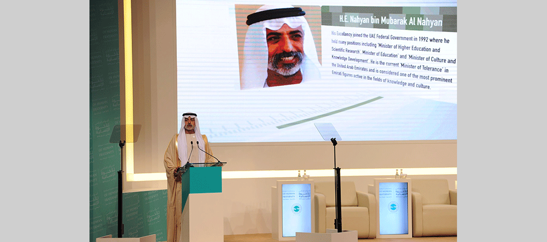 وقال الشيخ نهيان في كلمته الافتتاحية : "يعتبر هذا المؤتمر بمثابة فعالية متعددة الثقافية قائمة على التسامح الذي يُمكن ويُشجع المحبة والحوار والتفاهم والاحترام، وسوف تؤسسون اتحاد عالمي يهدف إلى تحديد التحركات التي من شأنها التأكيد على القيم المشتركة ومحارية قوى التطرف والإرهاب المدمرة ، الفقر، سوء التغذية، تدهور أحوال المرأة، إفساد البيئة، الأمية، الكراهية والتحامل، الجهل العلمي والتقني، الظلم وعدم وجود رعاية صحية ومحاربة فكرة الأخوة البشرية."