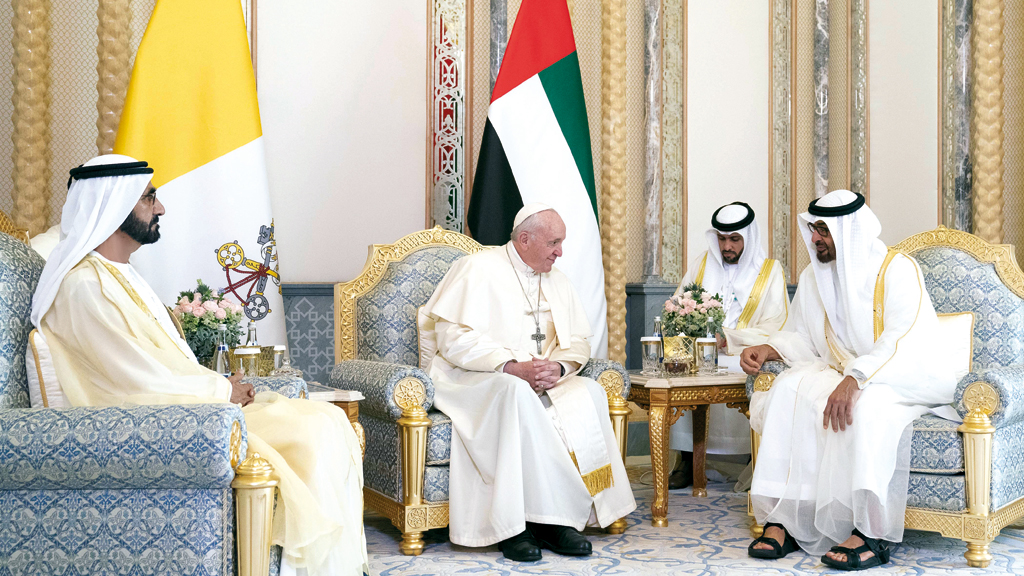 وكان صاحب السمو الشيخ محمد بن راشد آل مكتوم، وصاحب السمو الشيخ محمد بن زايد آل نهيان، استقبلا، أمس، قداسة البابا فرنسيس، بابا الكنيسة الكاثوليكية. وجرت للبابا فرنسيس لدى وصوله قصر الرئاسة مراسم استقبال رسمية، حيث رافق موكب الضيف ثلة من الفرسان على الخيول العربية الأصيلة في ساحة القصر، وأطلقت المدفعية 21 طلقة، تحية لضيف البلاد، بعدها عزف السلام البابوي للفاتيكان، والسلام الوطني لدولة الإمارات العربية المتحدة، فيما حلقت طائرات الفرسان في سماء قصر الرئاسة، مشكلة علم الفاتيكان، احتفاء بهذه الزيارة.