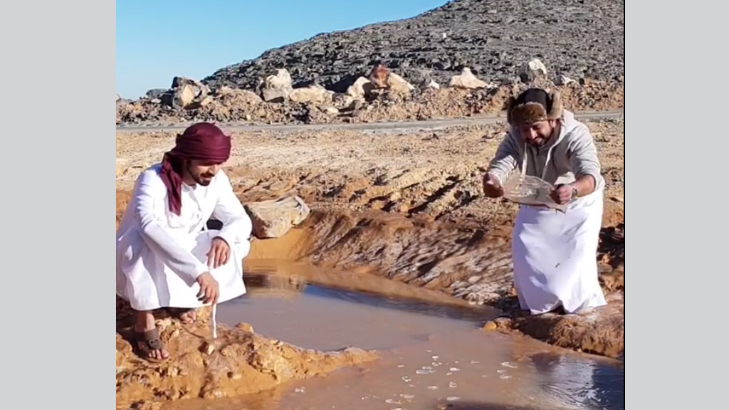رصد مطاردي الأمطار المواطنان راشد بنعزيز وطارق الشحي صباح اليوم تجمد مياه الأمطار فوق جبل جيس 1900 متر فوق سطح البحر أعلى قمة جبلية في الدولة، نتيجة تدني درجات الحرارة إلى أقل من الصفر حيث تجمدت مياه الأمطار المتجمعة فوق الجبل بشكل كامل نتيجة الصقيع وبرودة الشديدة للطقس مع انخفاض درجات الحرارة.