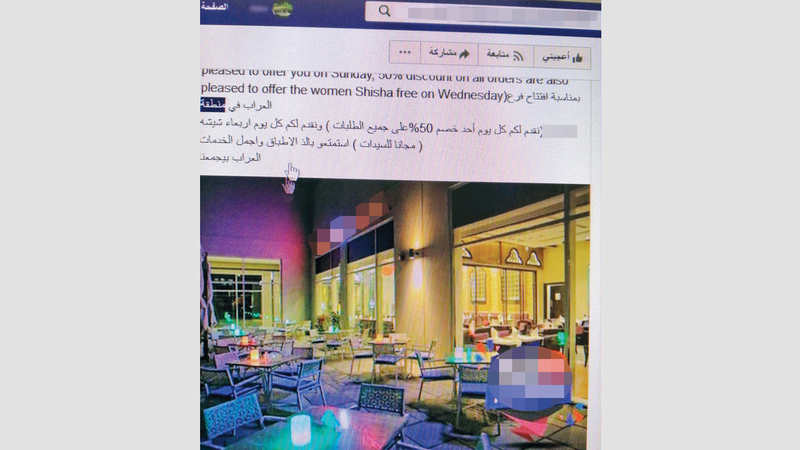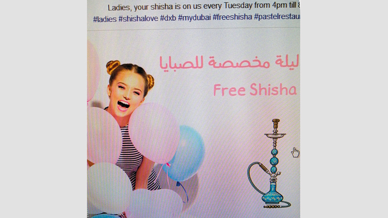 ورصدت «الإمارات اليوم» إعلانات على الـ«سوشيال ميديا» لمطاعم ومقاه تتضمن عروضاً لجذب الفتيات، تراوح بين تقديم أرجيلة مجاناً، وتخفيضات سعرية.