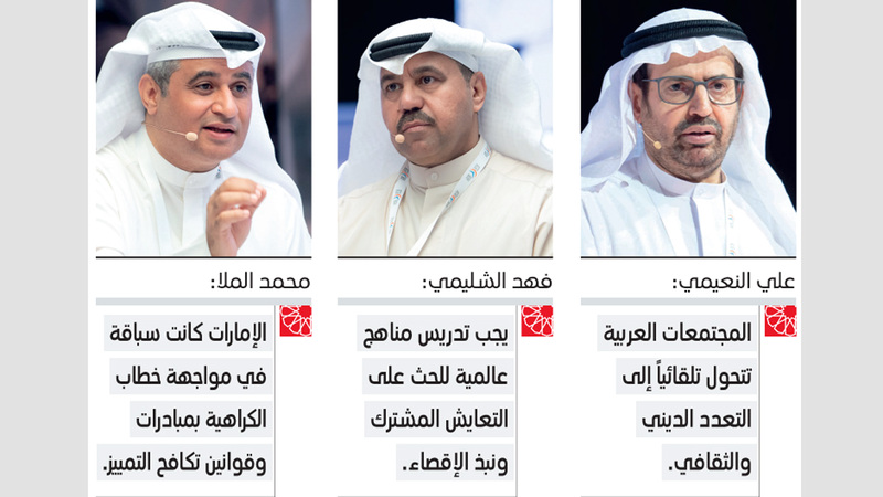 ودعا إلى مواجهة خطاب الكراهية بالتسامح والحوار مع كل أطياف المجتمع، مؤكداً أن الإمارات كانت سباقة في ذلك من خلال تبني مبادرات مثل «عام التسامح» و«جائزة التسامح»، والقوانين التي تكافح التمييز، وغيرها.