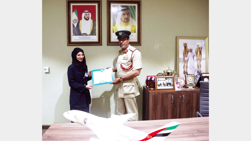 العميد علي عتيق بن لاحج يكرّم المفتشة حنان. من المصدر