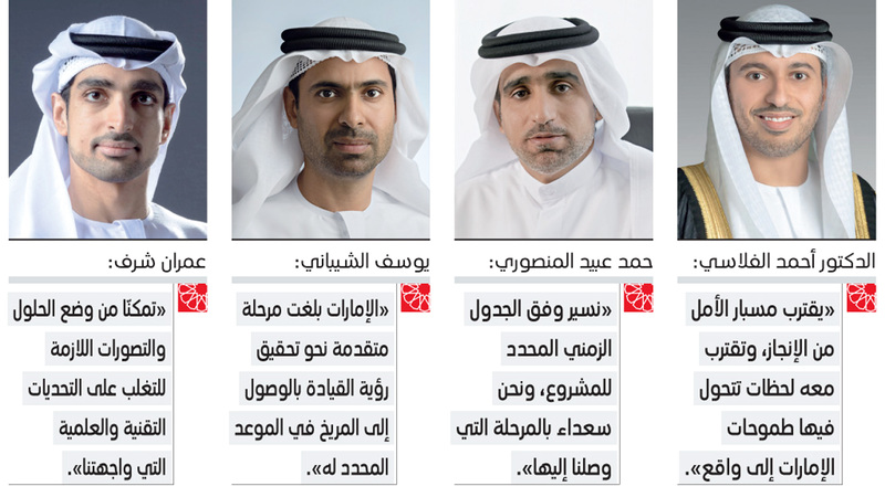 من جانبه، قال رئيس مجلس إدارة مركز محمد بن راشد للفضاء، حمد عبيد المنصوري: «نسير وفق الجدول الزمني المحدد للمشروع، ونحن سعداء بالمرحلة التي وصلنا إليها في العمل على مسبار الأمل، ومستمرون في مضاعفة الجهد نحو تحقيق إنجاز نوعي يضاف إلى رصيد إنجازات دولة الإمارات في مجال جديد لا يرتبط فقط بمستقبل دولتنا الغالية، لكن بمستقبل الإنسانية على وجه العموم».