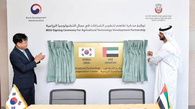 وقّعت هيئة أبوظبي للزراعة والسلامة الغذائية، أمس، مذكرة تفاهم مع إدارة التنمية الريفية بكوريا الجنوبية، بشأن تعزيز سُبل التعاون في مجال الأبحاث الزراعية والتكنولوجيا الحديثة، لتعزيز القطاع الزراعي بإمارة أبوظبي، وإرساء أسس مستدامة للبحوث الزراعية المستقبلية، لمواجهة تداعيات التغيّر المناخي، وتحقيق التنمية الزراعية الشاملة لدى الجانبين.