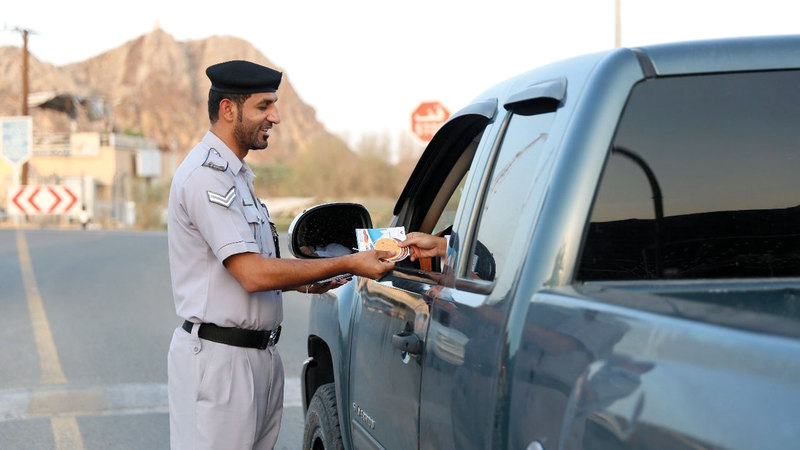 شرطة عجمان توزّع منشورات توعية على السائقين. من المصدر